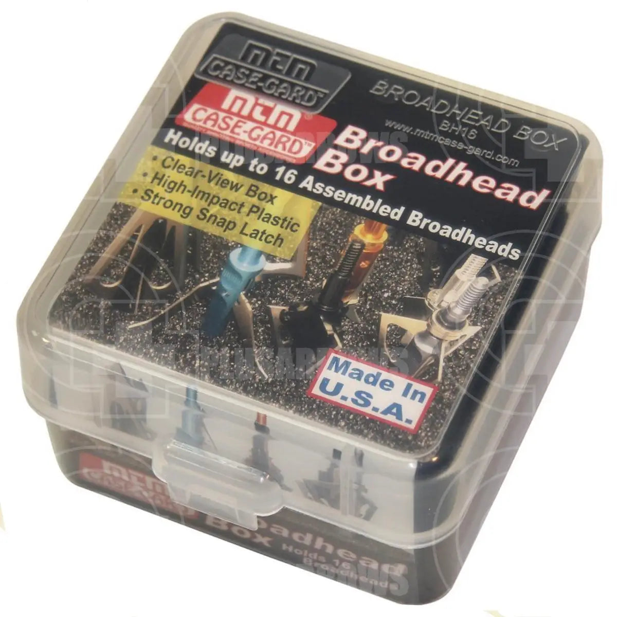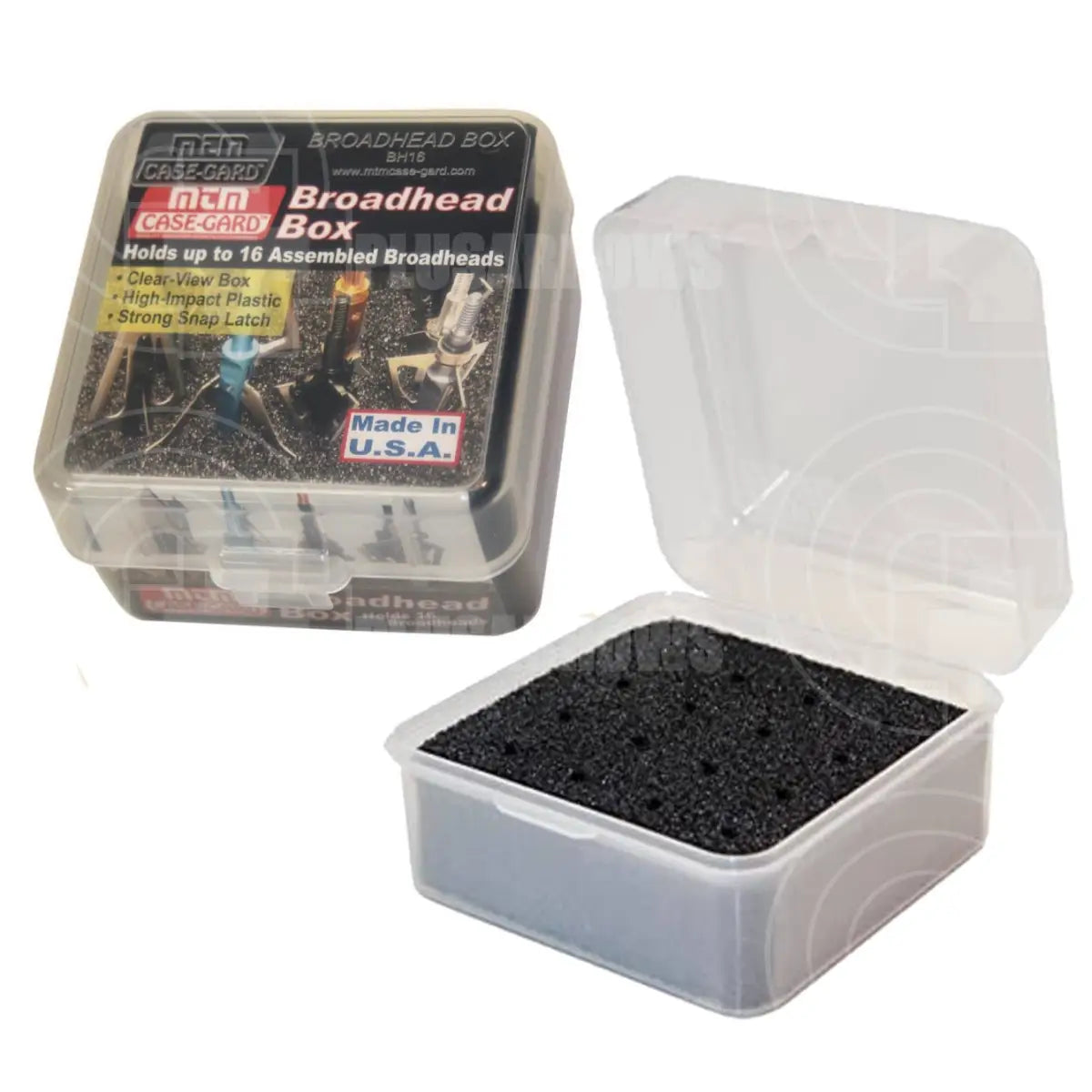MTM Broadhead Box offers safe storage for up to 16 fully assembled broadheads. Precut foam insert holds both expandable and fixed blade broadheads in either up or down position. The Clear-view lid allows for quick identification. Made of high-impact plastic, with strong snap latch and full length mechanical hinge. Broadheads not included.