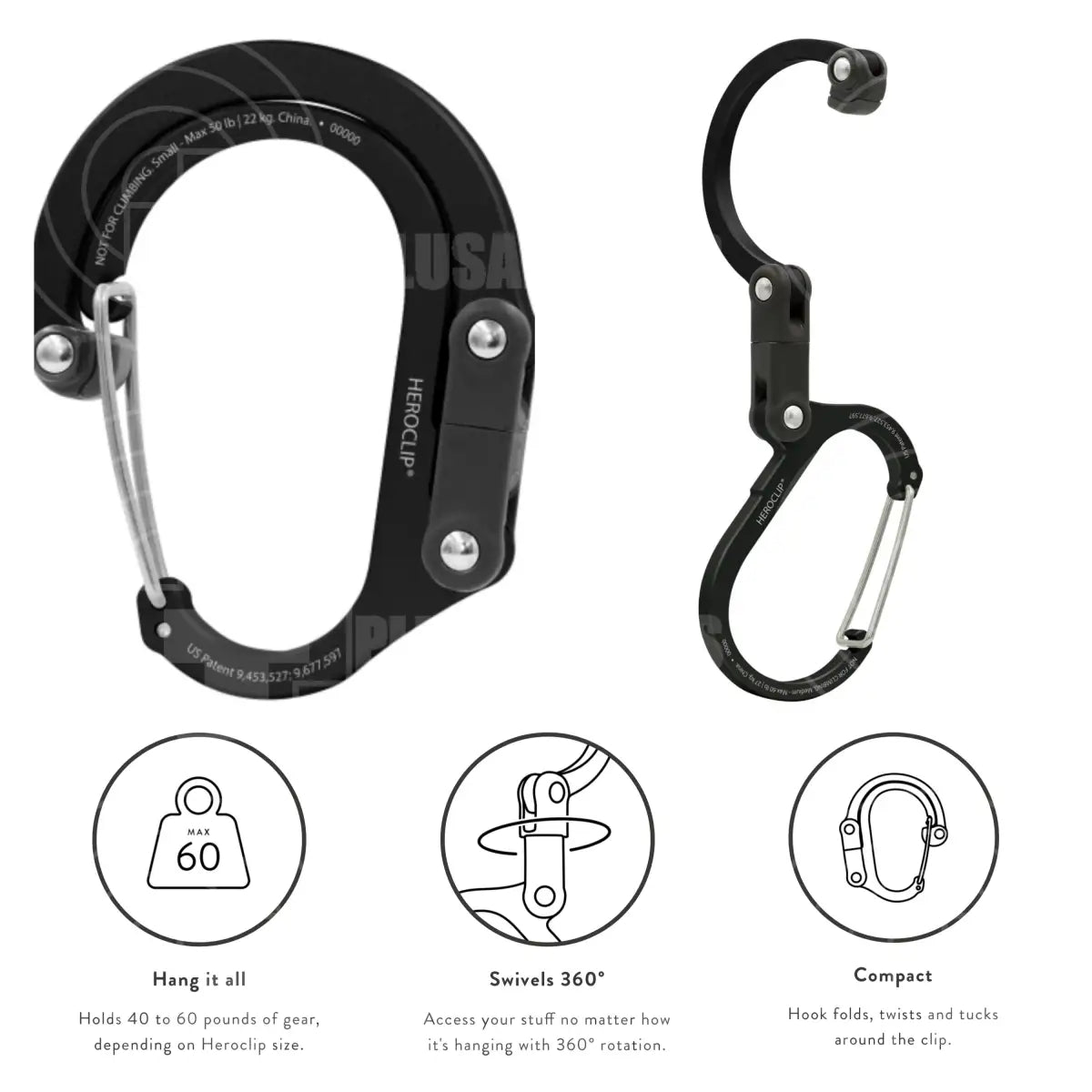 - Holds 40 to 60 pounds of gear, depending on Heroclip size