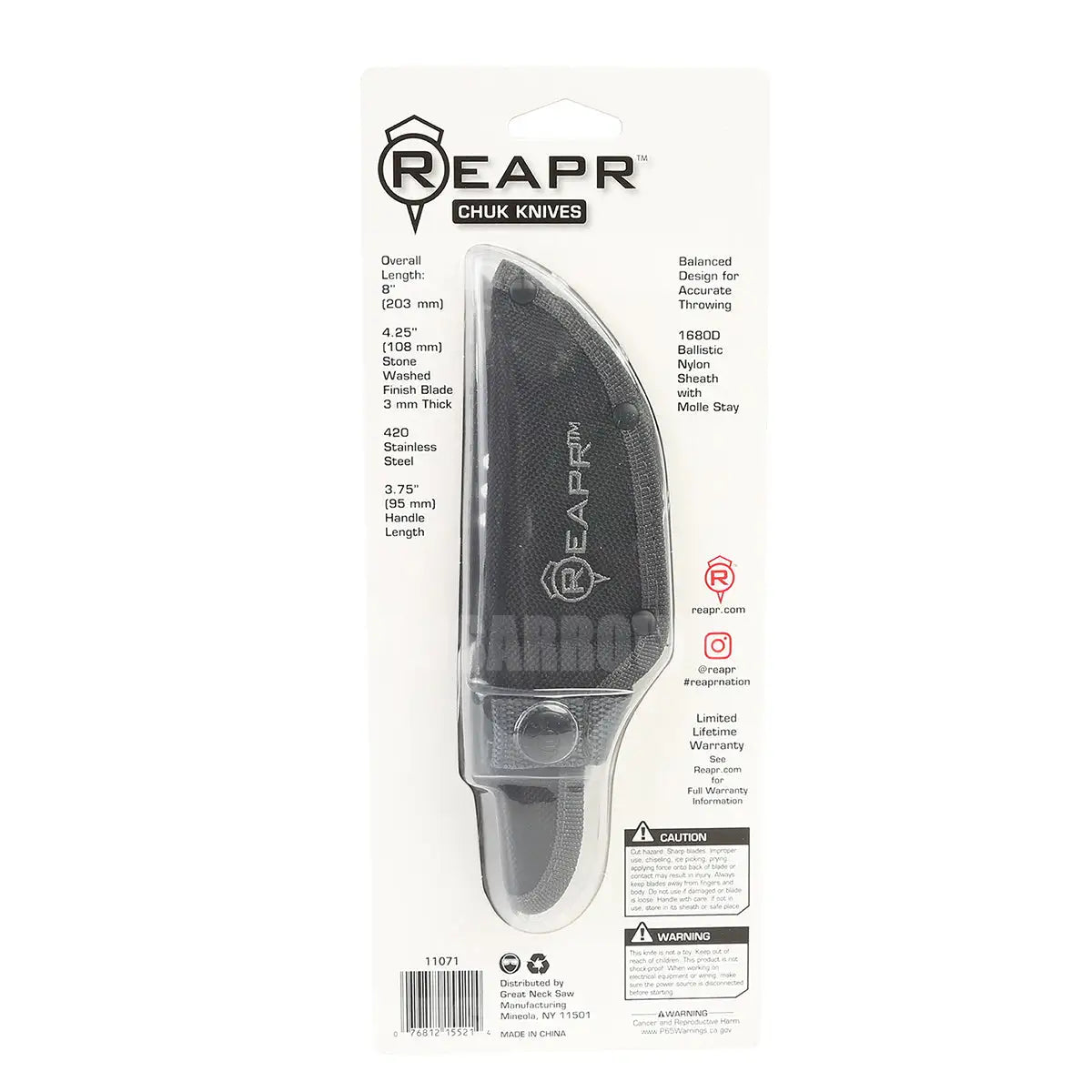 Hit the bullseye every time with these perfectly-balanced throwing knives. The Reapr 3 Piece Chuk Knives set is ideal for camping, parties, barbecues, and other outdoor activities. The 4.25” (108 mm) stonewashed finished blades withstands the elements and are built for throwing accuracy. The Chuk knives are constructed from 420 stainless steel and fit securely into the 1680D ballistic sheath with MOLLE attachment. Chuck it and see!