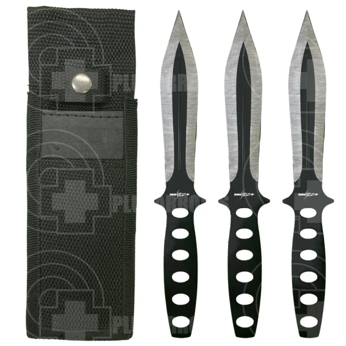 SICUT triple thrower set are one piece black coated stainless construction with two toned black and silver blades with a slot cutout design handle. The included black nylon belt sheath holds all three knives.
