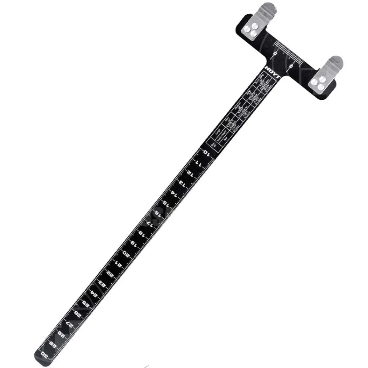 The Hoyt Bow Square is a precision tool constructed from anodized aluminium, designed for archers seeking exact tuning. Its T-Square style and laser-etched reference marks ensure accurate measurement of brace height, tiller, nock point location, and peep height. Securely attaching to the bowstring with metal clips, it offers stability during adjustments. The integrated Hoyt recurve brace height chart provides immediate, reliable reference, streamlining the tuning process for optimal bow performance. This essential accessory supports expert-level accuracy and consistency in bow setup.