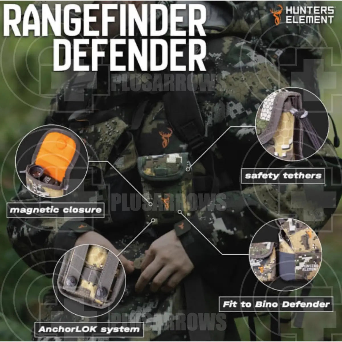 The Rangefinder Defender is a hardy protective pouch for your valuable rangefinder. A strong and quiet magnetic closure makes grabbing your rangefinder out and putting it away an easy, one-handed, no-look process. Small loops are attached to each side as safety tethers so you can connect the rangefinder’s wrist or neck loop. With the AnchorLOK attachment system it can be easily and securely attached to your Bino Defender, belt, pack webbing, etc.