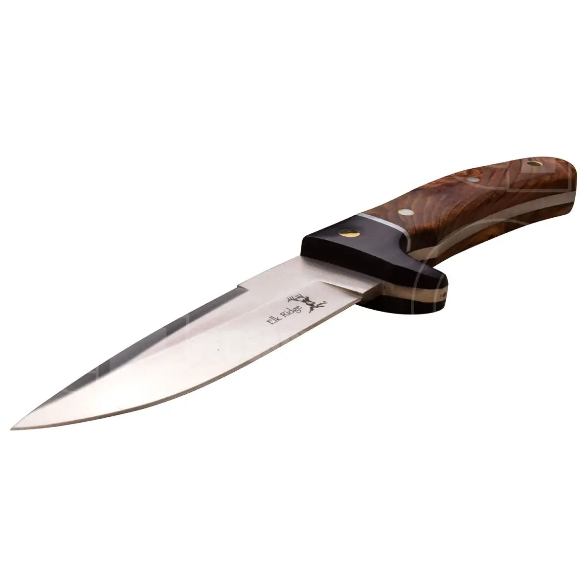 This Elk Ridge fixed blade knife is crafted from high-quality 440 stainless steel, featuring a 4.25" mirrored blade for precise cutting. The burl wood handle provides a secure grip while the included leather sheath ensures safe storage and transportation. Perfect for avid hunters and outdoor enthusiasts.