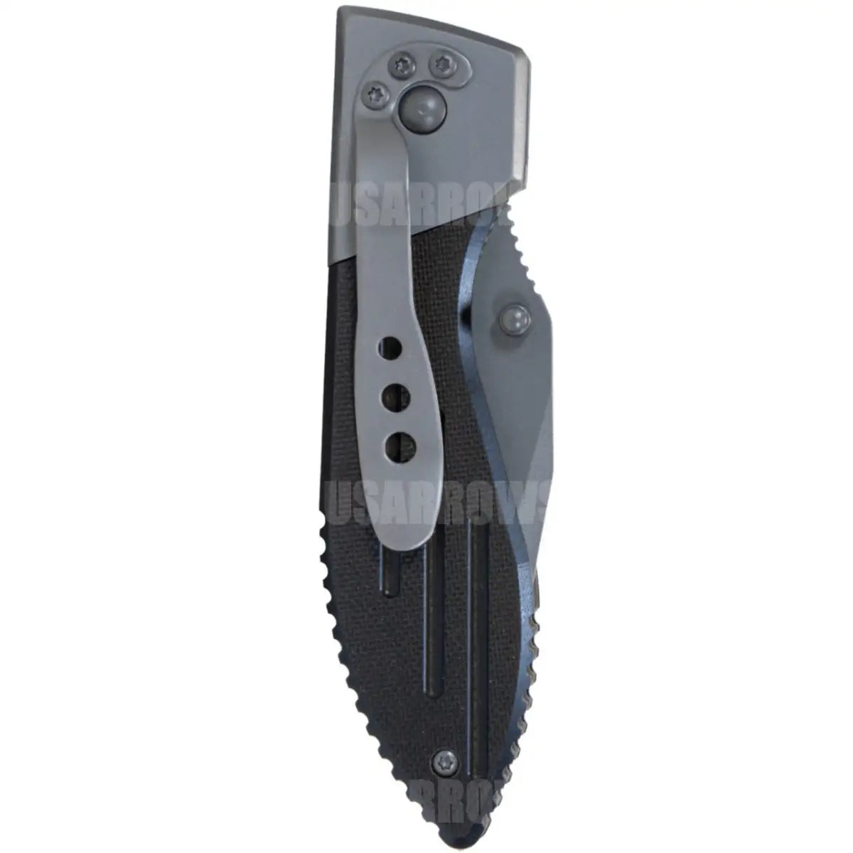 - 7.653 inch overall with Black G10 handle with gray titanium finish stainless bolster