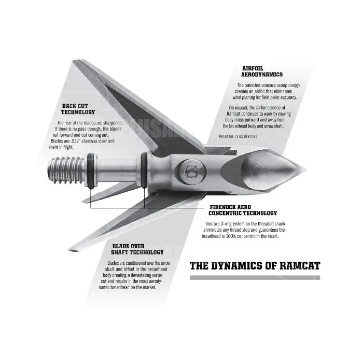 Ramcat Hydroshock broadheads are the first blade over shaft broadheads on the market. Ramcats have been independently tested with crossbows and compound bows and have been found to be the most accurate fixed blade broadhead on the market. Both the 100 grain and 125 grain Ramcats show the same accuracy as your field points because they are a one piece, stainless steel body ferrule that have a Hydroshock Self-Centering Chisel Tip with patented deep lobes and with Aero Insert Technology. The patented deep lobes create an airfoil that drafts wind over the blades and disallows windplaning. The Aero Insert Technology is a double O-ring system on the threaded shank which ensures that your broadhead and arrow are perfectly concentric. The Ramcat Broadheads are not only field point accurate but they are deadly quiet in flight. Ramcats are endorsed by the MI, MD, and MS Crossbow Federations and have been awarded a 5-star rating by Crossbow Magazine. Ramcats are the hardest hitting, deepest penetrating, most accurate broadheads on earth.