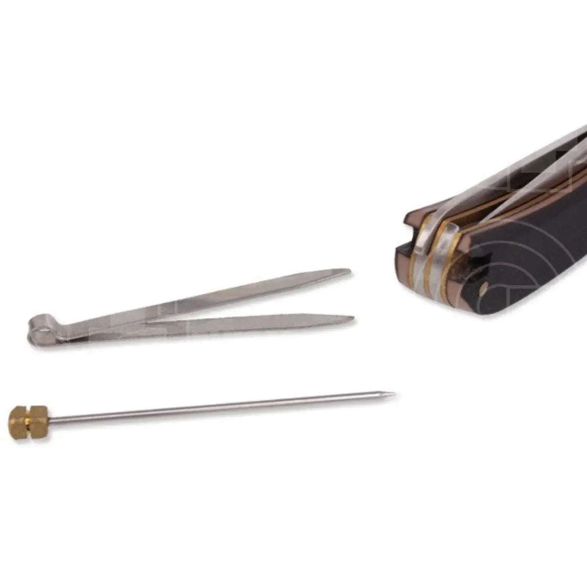 The Bearhead Trapper is a 2-blade general purpose stock knife with a general-use blade and a castrating blade. It also features a steel pick and tweezers.