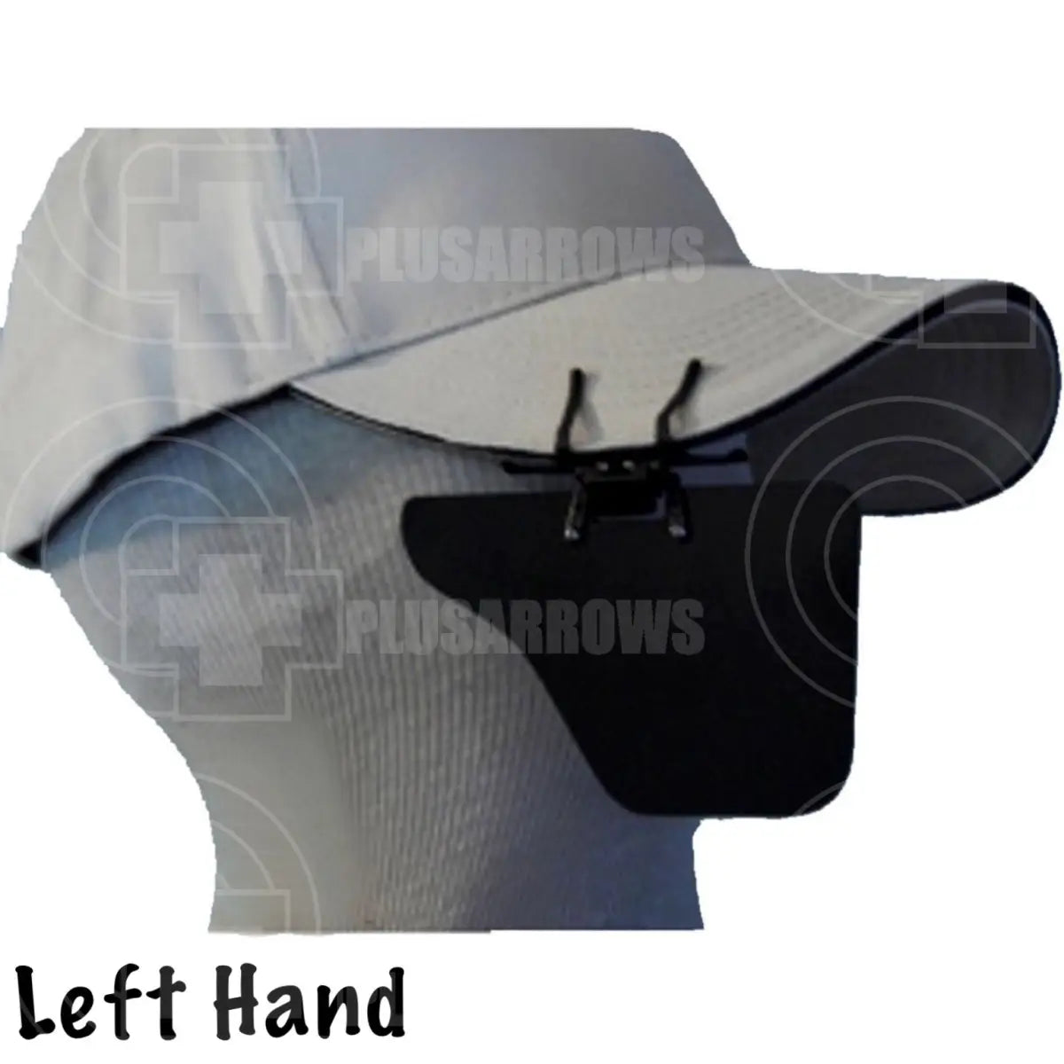 The Eye Blinder Left Hand attaches to the right side of the brim of a hat of a left-handed archer, so it blocks the right eye.