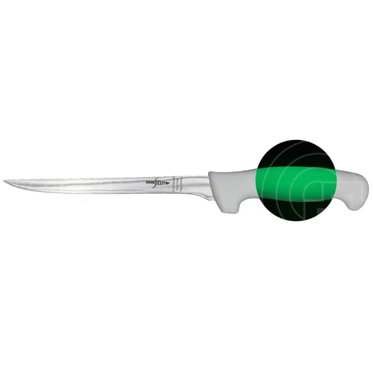 SICUT’s 7” fillet knife is all made with a stain-free, high-carbon steel blade that achieves a 55 Rockwell Hardness, with an individually ground and honed edge at a 25 degree angle, easy to sharpen, which makes them perfectly suited to any recreational or commercial use.