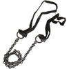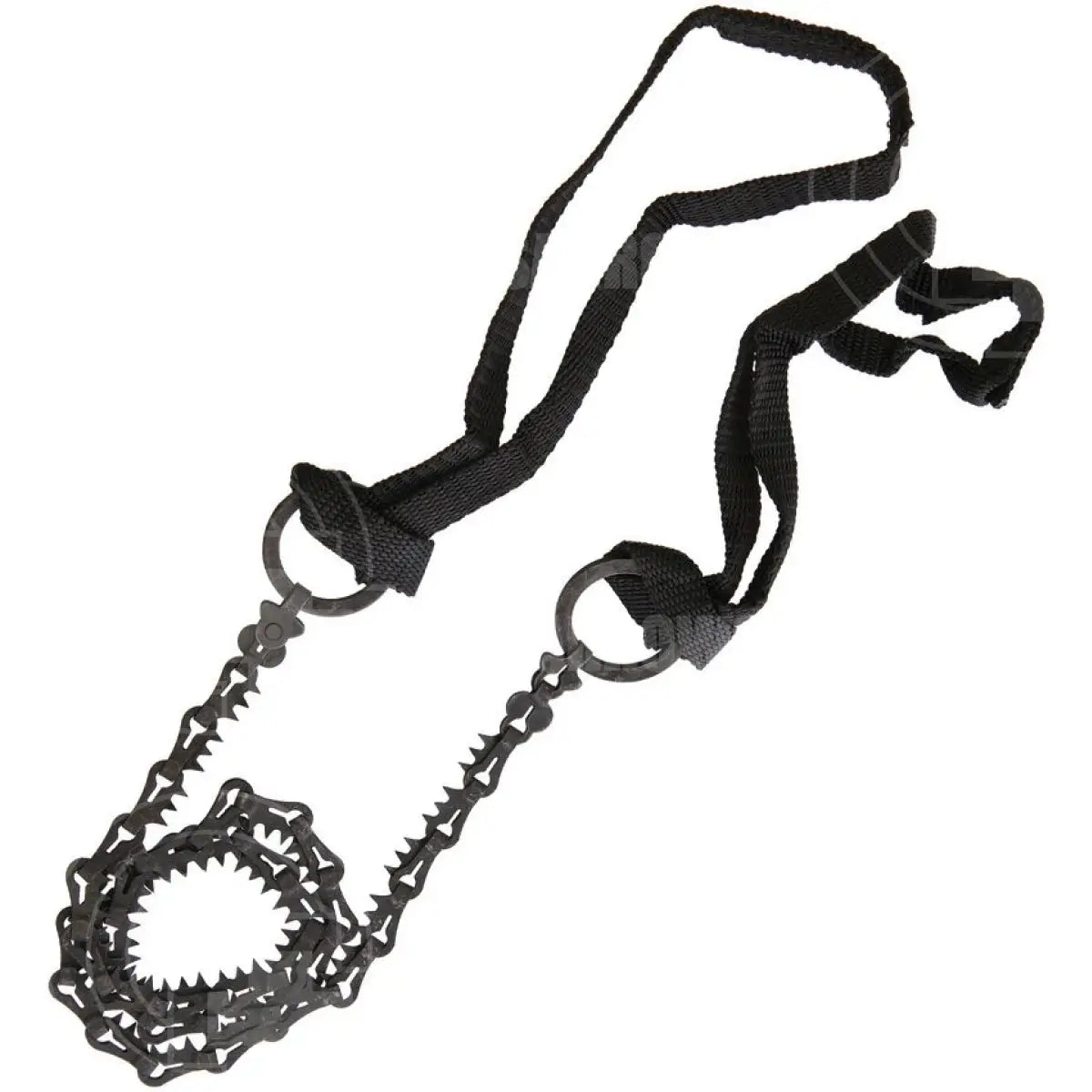 A Pocket-Sized chain saw, ideal for survival situations. Made from riveted sections of band-saw style blade. Will cut through 8cm (3") branch with minimum effort. Bi-directional cutting and tapered teeth. Can be thrown over high branches. Two webbing-loop handles. Camo nylon pouch. Bulk packed.